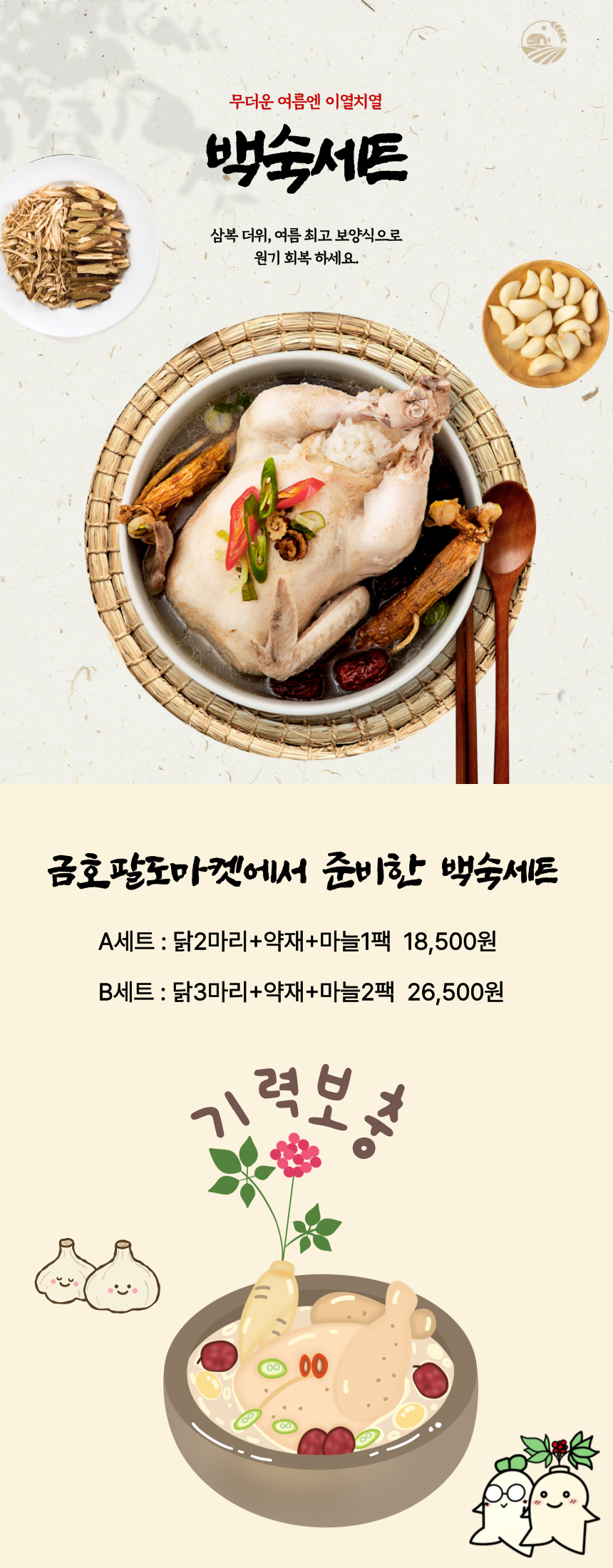 생닭 + 약재 + 마늘팩