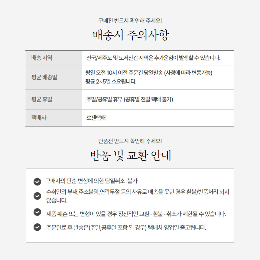 - 규정된 시간 이후의 접수 건은 보관상 문제로 취급하여 교환 및 환불이 불가능합니다.